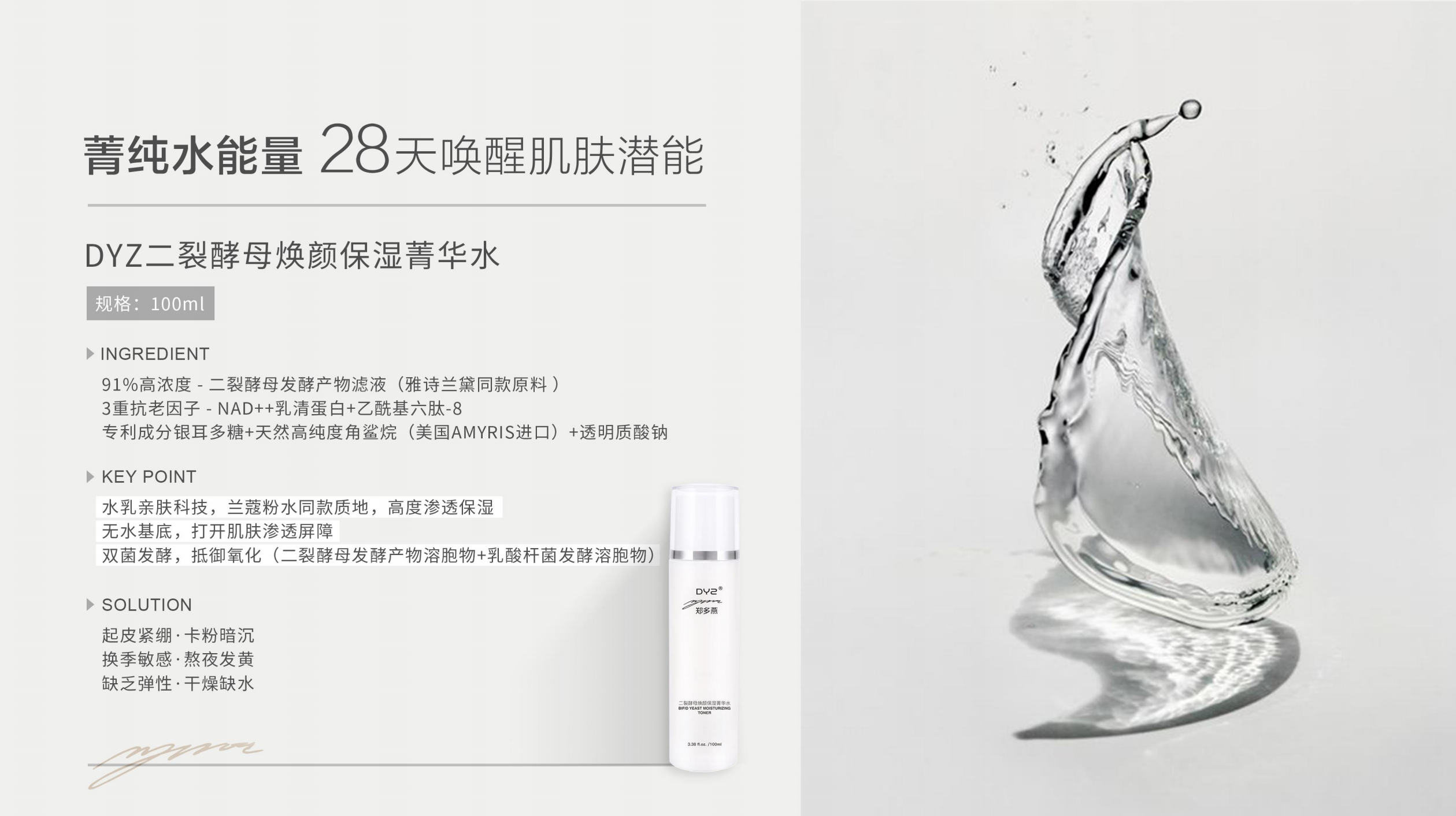 DYZ郑多燕 品牌灵感 DYZ以亚洲的中和平衡哲学为灵感重构功效护肤,专注活性成分与亚洲植萃的生物学研究,探索温柔而猛烈的护肤力量。 希望是隐藏在群山后的繁星,探索是人生道路上倔执的旅人,探索值得拥有的美,做岁月长河中的逆行者,在恬淡时光里,拥有岁月的沉香。